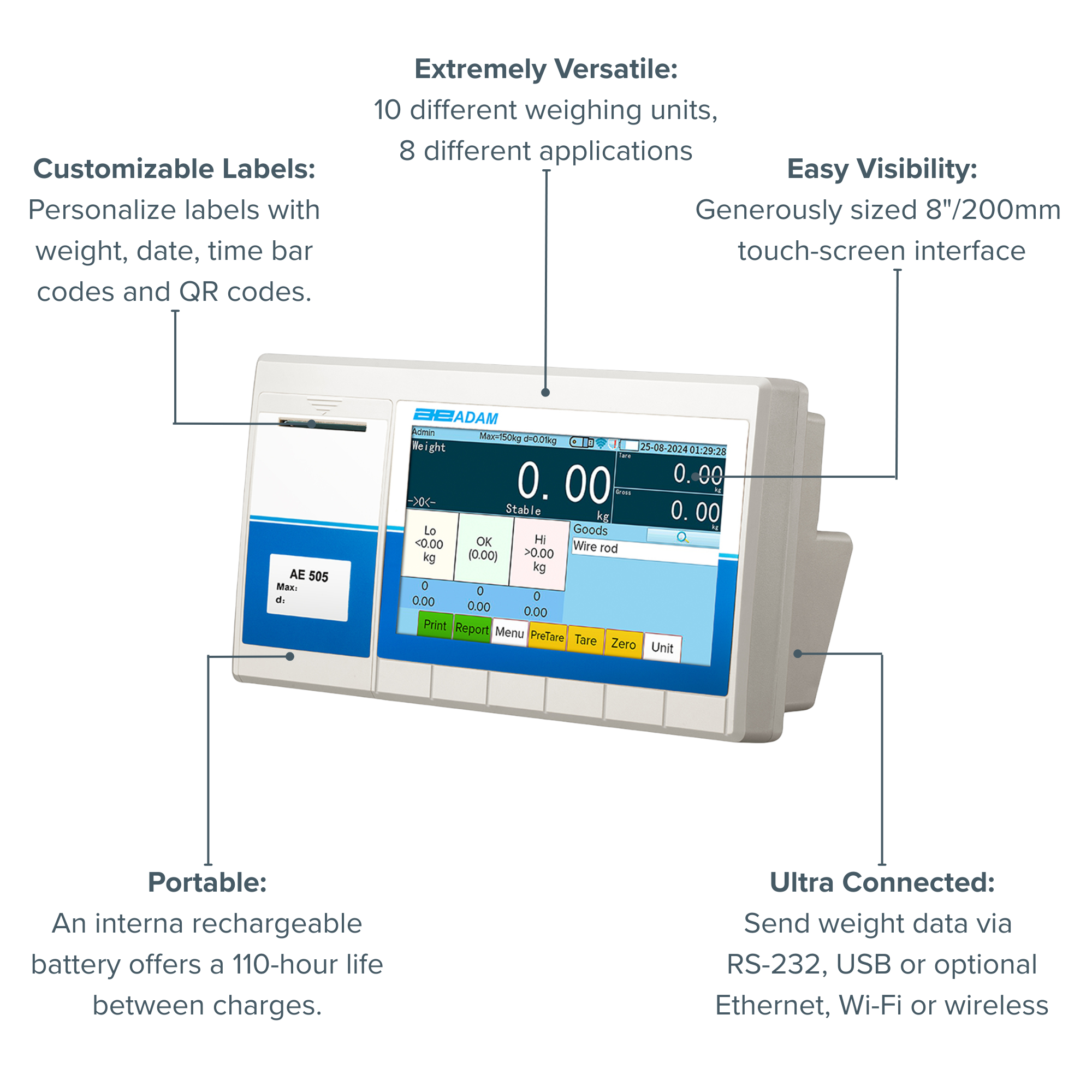 Combining the ease and intuitive navigation of an 8” / 200mm touchscreen display with the convenience of a built-in printer, USB, RS-232 and optional ethernet, Wi-Fi and wireless connectivity, AE 505 ushers in the next generation of weighing indicator. In addition to creating fully customized labels of multiple lengths with the included software, AE 505 stores up to 10 label designs in its memory.