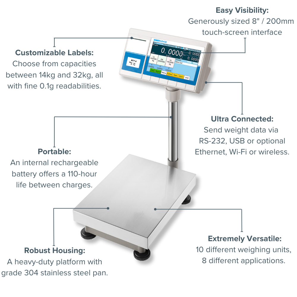 Offering innovative stock and inventory control features, the BTT bench and floor scales combine user-friendly touch-screen controls with advanced weighing technology, offering users enhanced accuracy, built-in connectivity and all-in-one label printing convenience.